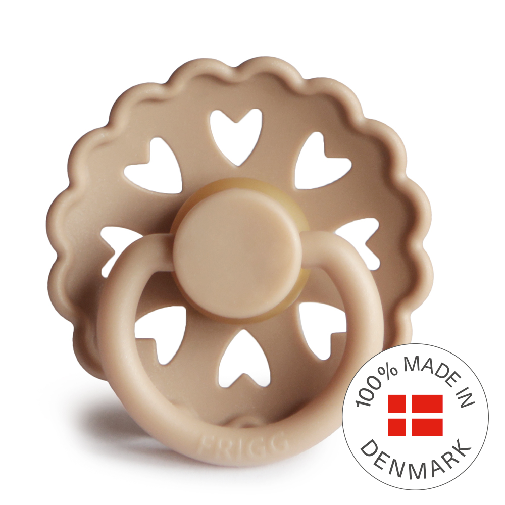 FRIGG Fairytale with scalloped edges and hearts surrounding the shield mimic one specific paper cutting by H. C. Andersen. The 8 little hearts support the universality of his creative work, and they symbolize love, the universal language of the world. This is the inspiration that lies within the FRIGG Fairytale pacifiers: They are approachable for everyone because love is a language, everyone can speak and understand.