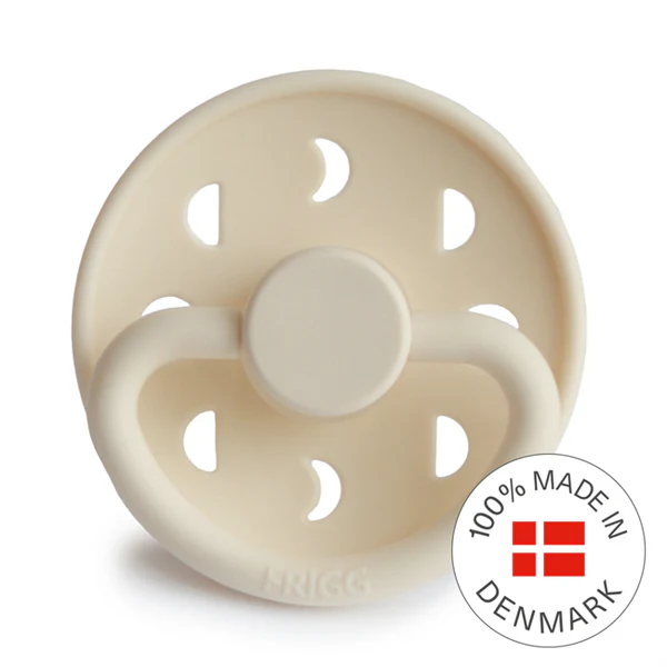 FRIGG Moon Phase is a round pacifier with a round nipple shape. The round pacifier resembles a mother’s breast in both shape and material. The explanation for this is that when the child is about to breastfed, the tongue rolls up around the nipple and creates a vacuum, which causes the milk to flow. When the child sucks on a round pacifier, it rolls its tongue around it the same way.
